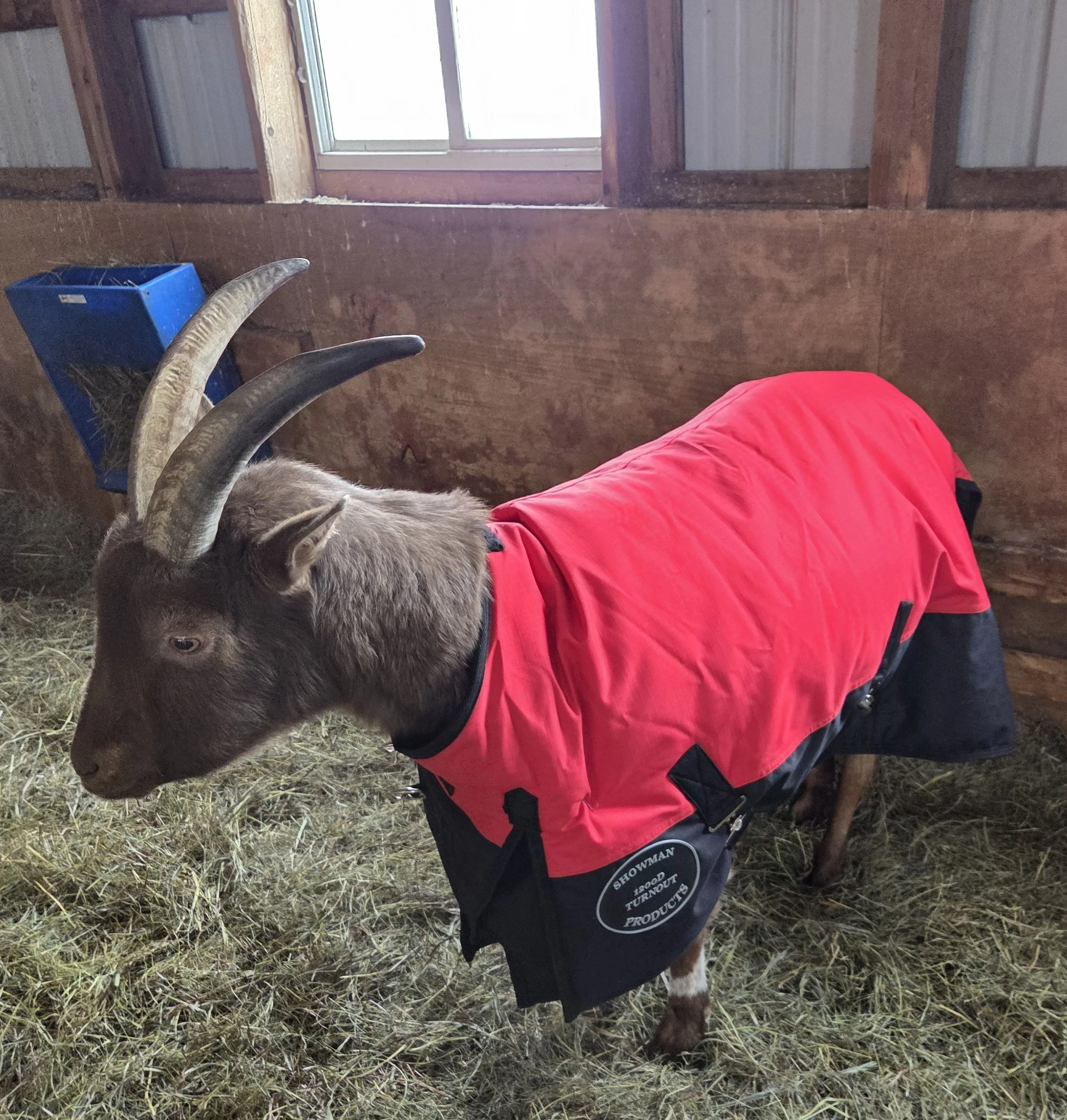 Ellie’s goats needed coats, too. This is Diego in a blanket made for a baby horse. He is the biggest goat and is not an angora goat like all the rest. The chest was a little big for him but safety pins took care of that. Diego wasn’t thrilled about putting it on, but it kept him warm!