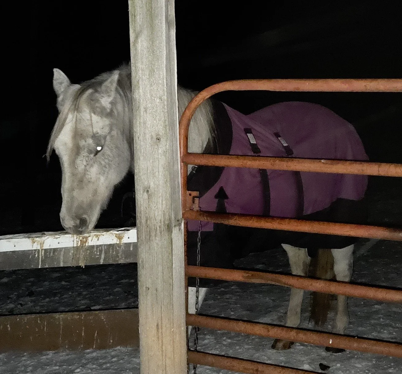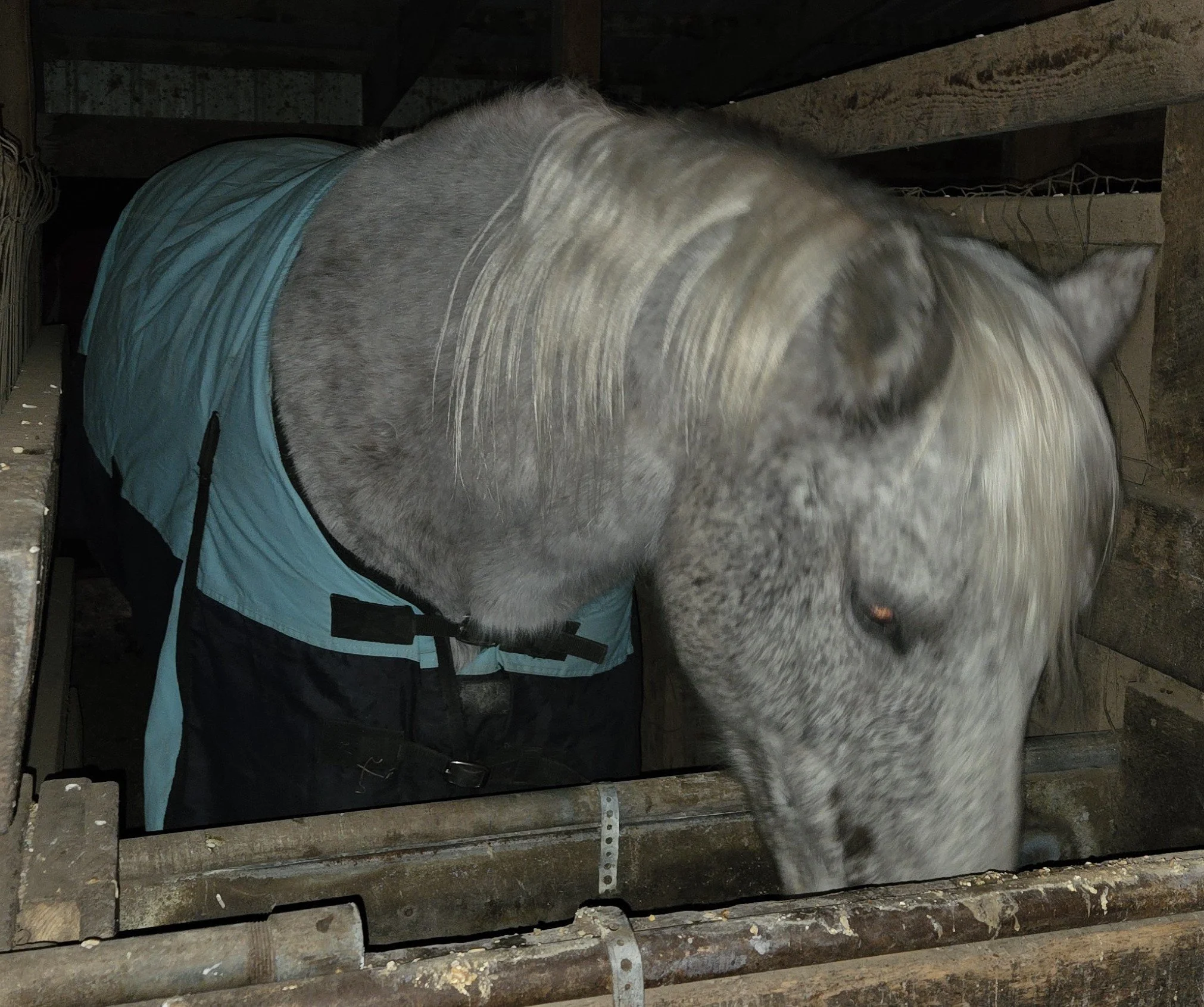 Gator has a reputation from his previous owner that he takes his blanket off most of the time. He hasn’t taken it off yet. Here he is eating his supper. He gets very excited about eating and doesn’t hold still very well.