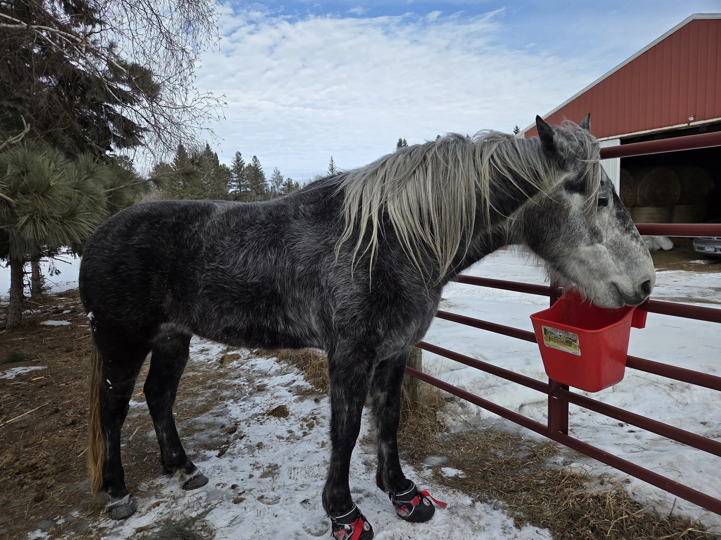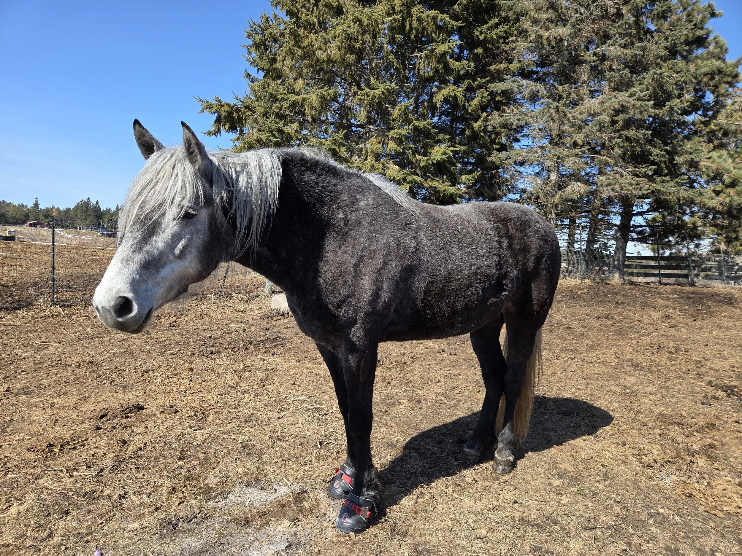Sapphie is sporting some very fashionable footwear right now. She got a couple of infections in her feet so now she wears boots to keep her feet clean. Infections like the ones she got are common as feet are growing out after an episode of laminitis. Keeping them dry in the boots is important and we are trying several different products to help with that. Her feet are doing very well with it.