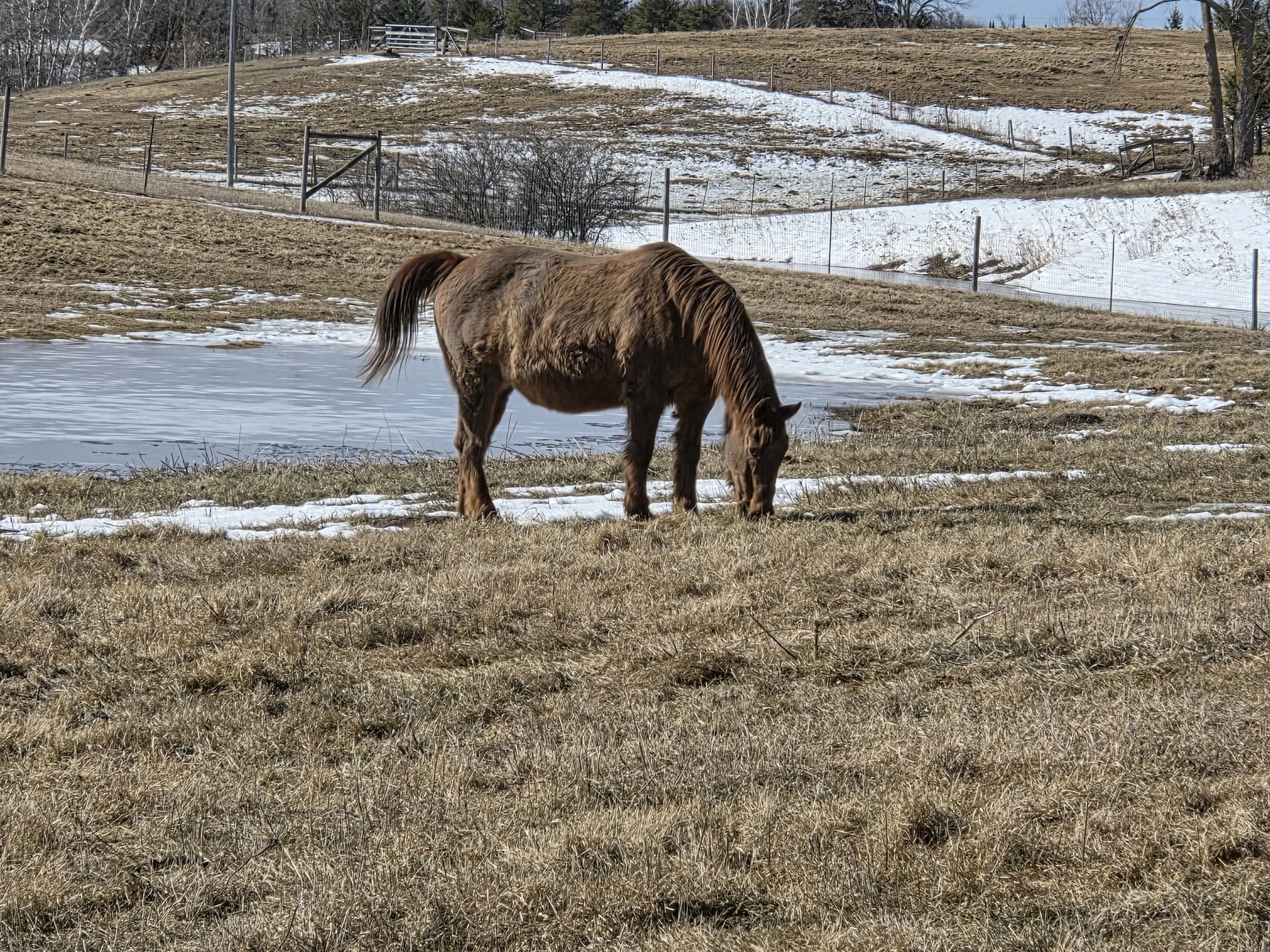 This is a very shaggy Dusty enjoying the grass under the melted snow. It is just like hay that hasn’t been baled up. The horses like to forage the first time the snow melts. Dusty has had a good winter, as you can see by how round she is!